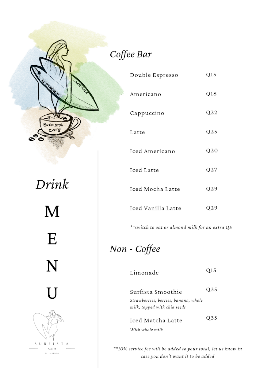 Food selections include sandwiches, with options like the Surfista Sandwich, designed for light meals or quick bites. Overall, the menu caters to those looking for a combination of light food and a range of beverage choices in a casual setting.